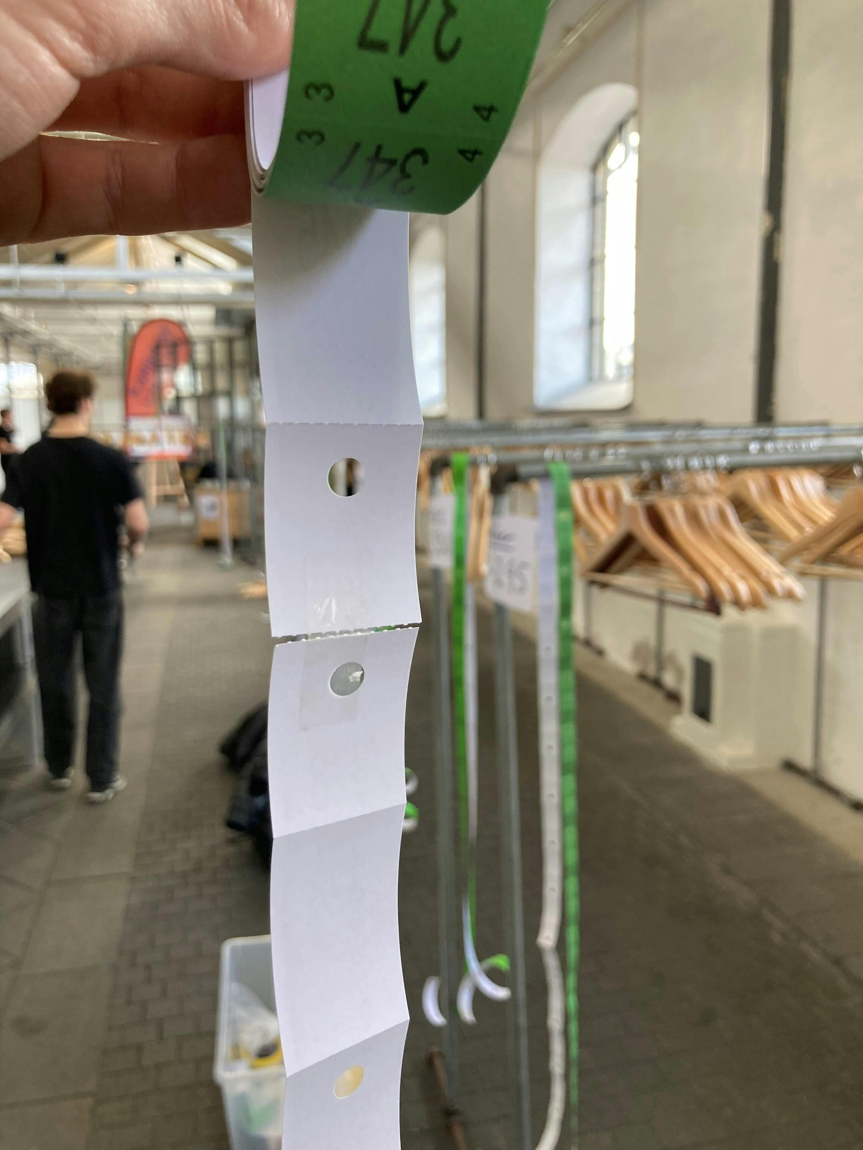 Der manglede desværre flere numre - midt i rullen var to mærker tapet sammen... Førte til udfordringer i garderoben, som var unødvendigt ift. hvor simpelt det er at lave en rulle mærker.