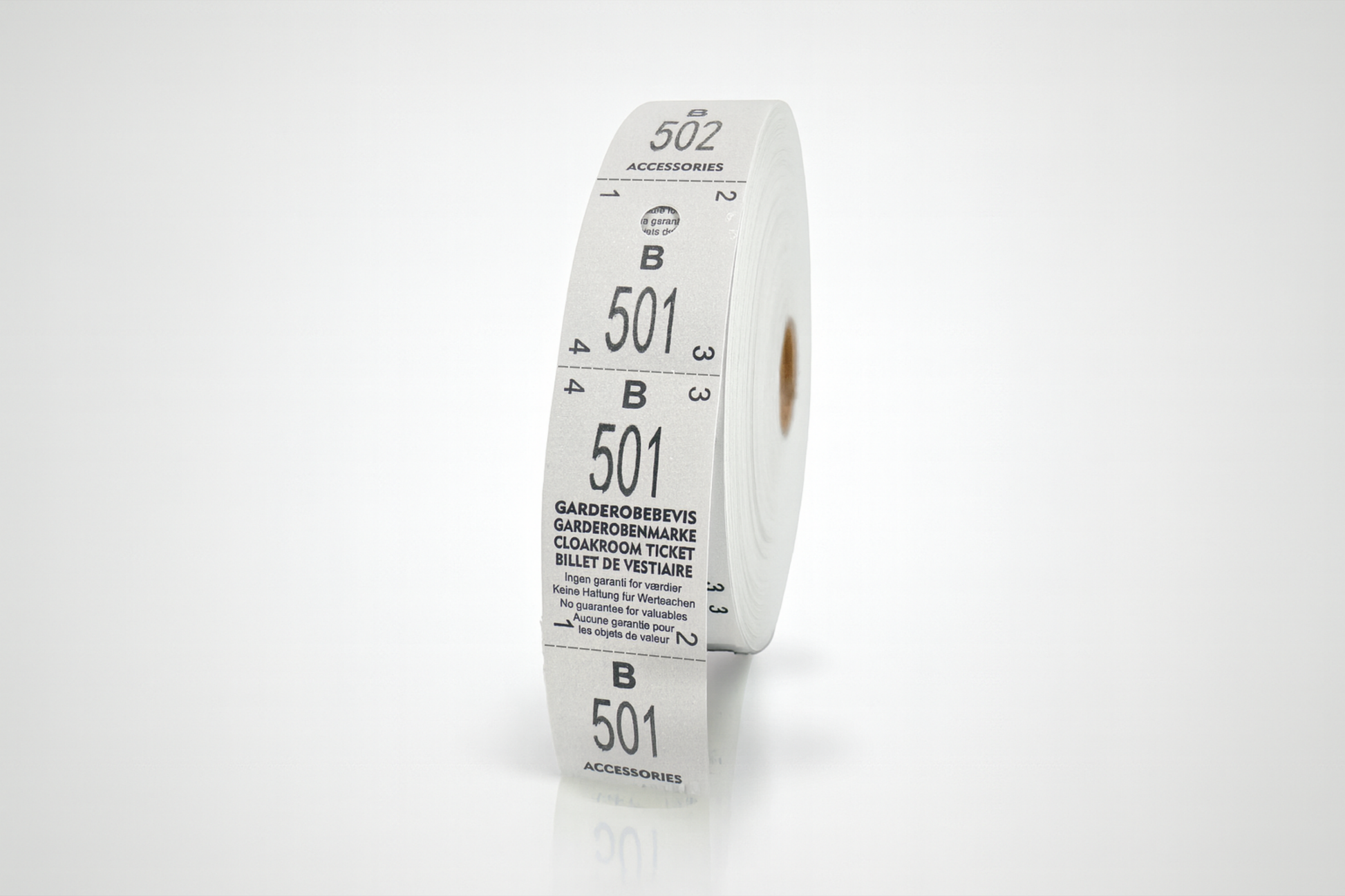 Hver mærkeseddel har tre identiske numre - ét til gæsten, ét til tøjet og ét som kontrolkopi for personalet. Det giver ekstra sikkerhed og nem organisering. Leveres i blokke med 500 stk.